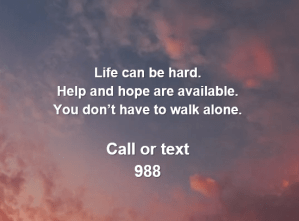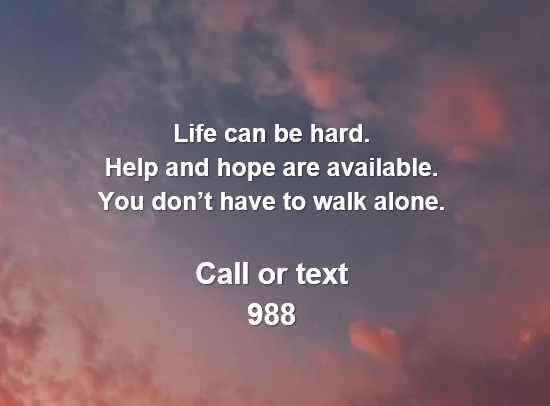 If you or someone you know is experiencing mental health challenges or struggling with depression, please know that confidential, professional help is available 24 hours a day, seven days a week. Just call or text 988 or start a chat online at 988lifeline.org and connect with a trained crisis counselor.