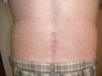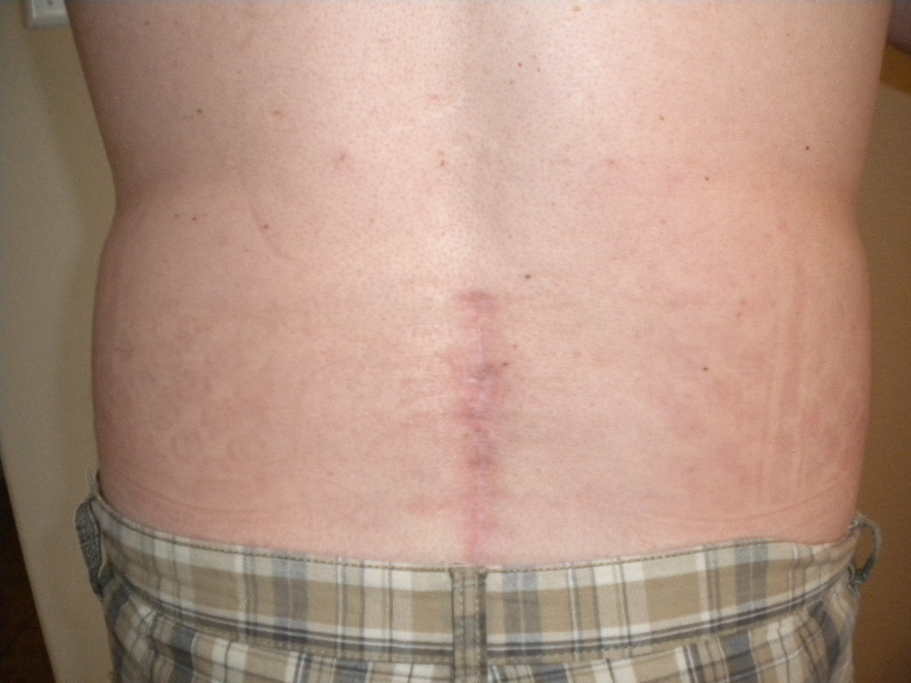 My recovery is still going very well. It has been approximately 5 and a half months since my back surgery and I feel great. I don’t think I took any pain meds past the third week. I would have to go back and check the blog to know the exact day for sure, but to borrow a phrase from Mr. James Brown, “I feeeel good! Hah!” Below is a photo of the scar from the incision from the surgery.