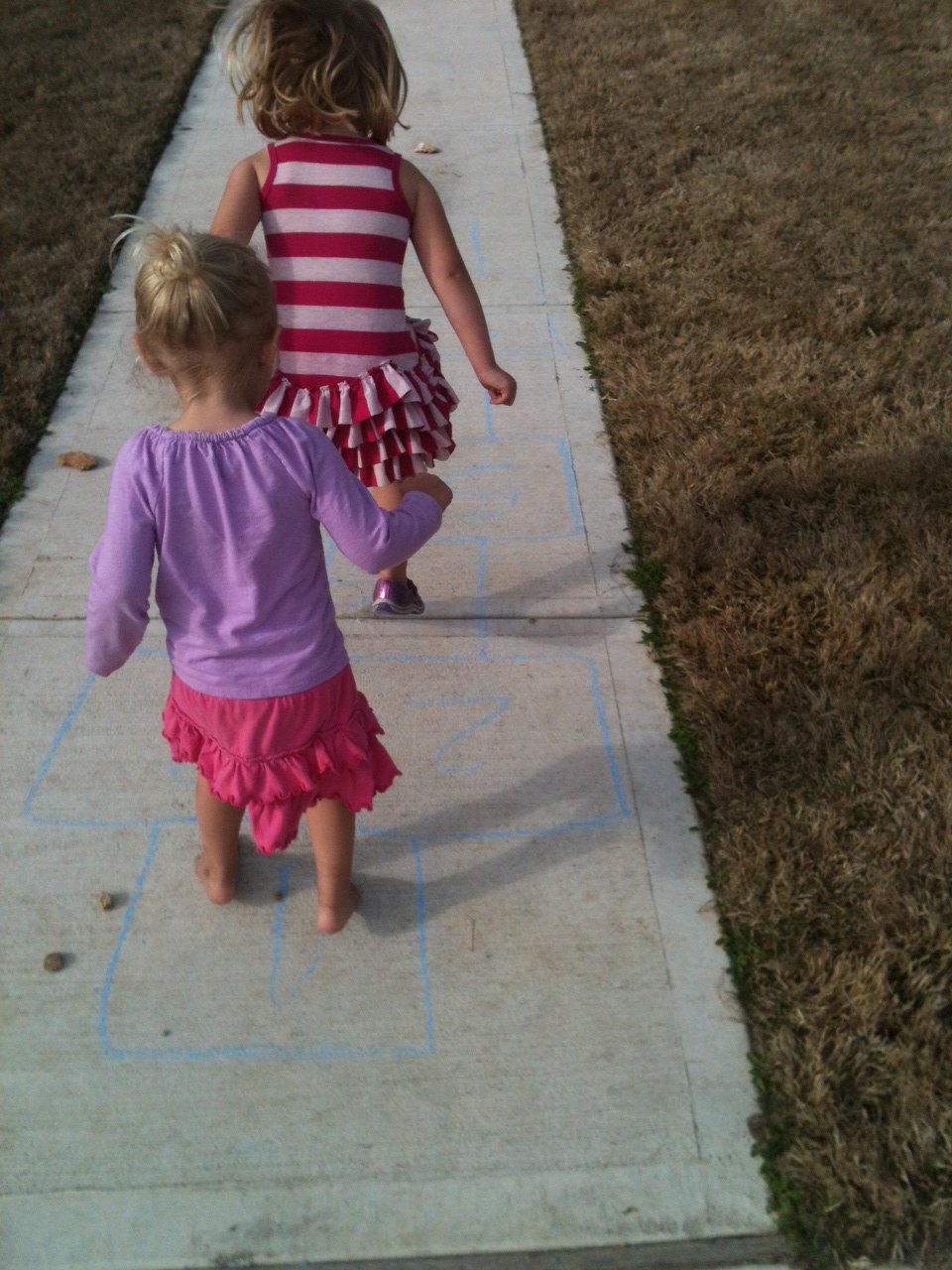 I am so blessed to have my granddaughters live just a few houses away. (Avery is 4 and Haley is 2.) Today when I came home from work I saw my daughter with the girls standing in front of their house. After I parked the car I walked down the block to see what they were up to. My daughter Lauren was teaching the girls how to play hopscotch. Avery explained it to me, “It’s all about squares and numbers and throwing rocks, Papaw. You throw a rock and you hop, hop, hop.” She and Haley proceeded to demonstrate several times and to my surprise I did not have to dodge any rocks. Those girls learn fast. I am so proud of the good mom that my daughter has turned out to be. I am not surprised by any means as my wife was such an excellent mom to our kids. But I just love seeing my daughter take the time to teach the girls about so many things. She makes sure to teach them about everything she thinks is important… not just numbers and letters but other things too. She teaches them the importance about loving the Lord, loving others and loving themselves. She makes sure that they know what it means to be kind, considerate and respectful. She even makes sure that they know about fun stuff like how to play hopscotch.