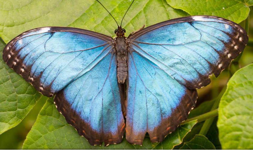 I took this first picture when we were visiting the Tennessee Aquarium in Chattanooga. They have a lot of great things to see and one of my favorite exhibits was the Aquarium’s Butterfly Garden. They had several different types of butterflies and many would land on your hands. It was so cool. This large butterfly resting on some unknown gentleman’s hand is known as a Blue Morpho. The name comes from the blue color that is seen on the top of their wings (that photo courtesy of the Aquarium’s website). The brown underside helps them stay camouflaged while they eat fruit from the forest floor.