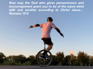 I have found that I have offered myself more grace and patience while learning to ride the unicycle than I have offered myself in other areas and at other times of my life. I know there have been times in the past where I have been too critical of myself or too critical of others. We live in a society that demands instant success and immediate progress and does not provide allowances for falling down and having to pick oneself back up. In our society, we would rather point out the falls and the failures rather than praise the persistence and the progress – no matter how slight the progress may be. I am afraid that too often we get caught up in pursuit of perfection and as a result, we do not offer enough grace to ourselves or to others. When it comes to learning to ride a unicycle or just life in general, we need to practice the exhortation we find in Romans 15:5