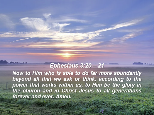 Ephesians 3:20 Now to Him who is able to do far more abundantly beyond all that we ask or think, according to the power that works within us, 21 to Him be the glory in the church and in Christ Jesus to all generations forever and ever. Amen.