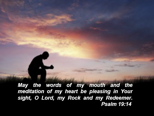 Psalm 19:14 May the words of my mouth and the meditation of my heart be pleasing in Your sight, O Lord, my Rock and my Redeemer.