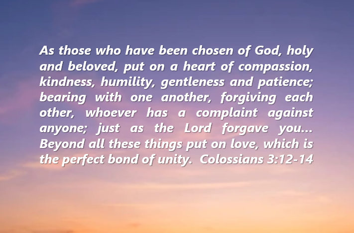 Colossians 3:12 “So, as those who have been chosen of God, holy and beloved, put on a heart of compassion, kindness, humility, gentleness and patience; 13 bearing with one another, and forgiving each other, whoever has a complaint against anyone; just as the Lord forgave you, so also should you. 14 Beyond all these things put on love, which is the perfect bond of unity.”
